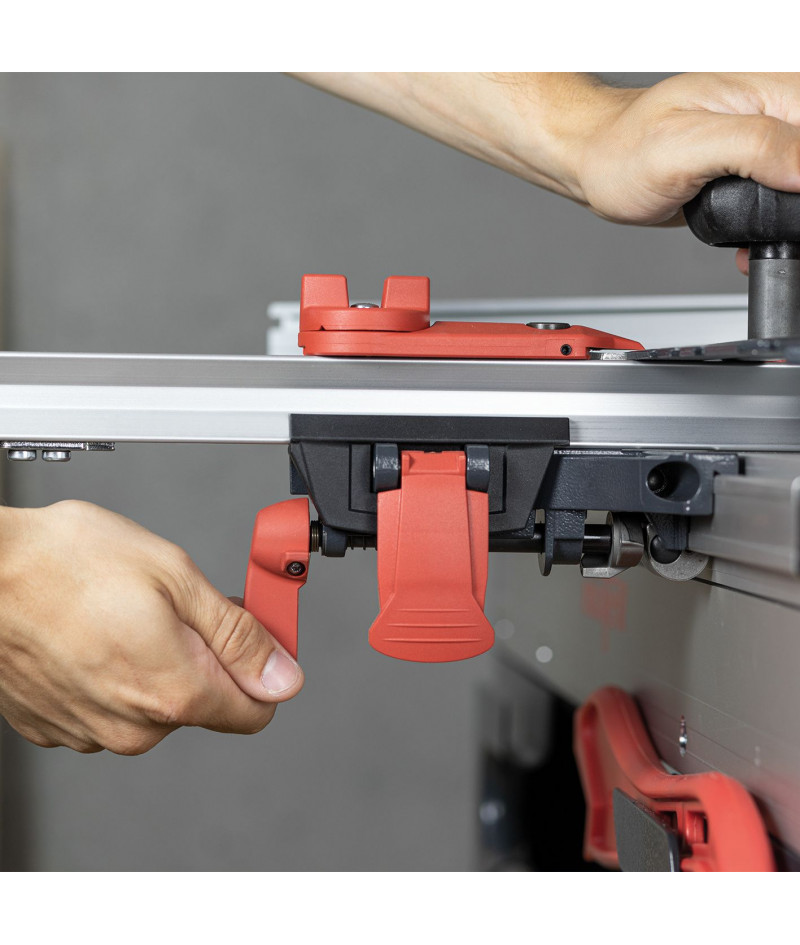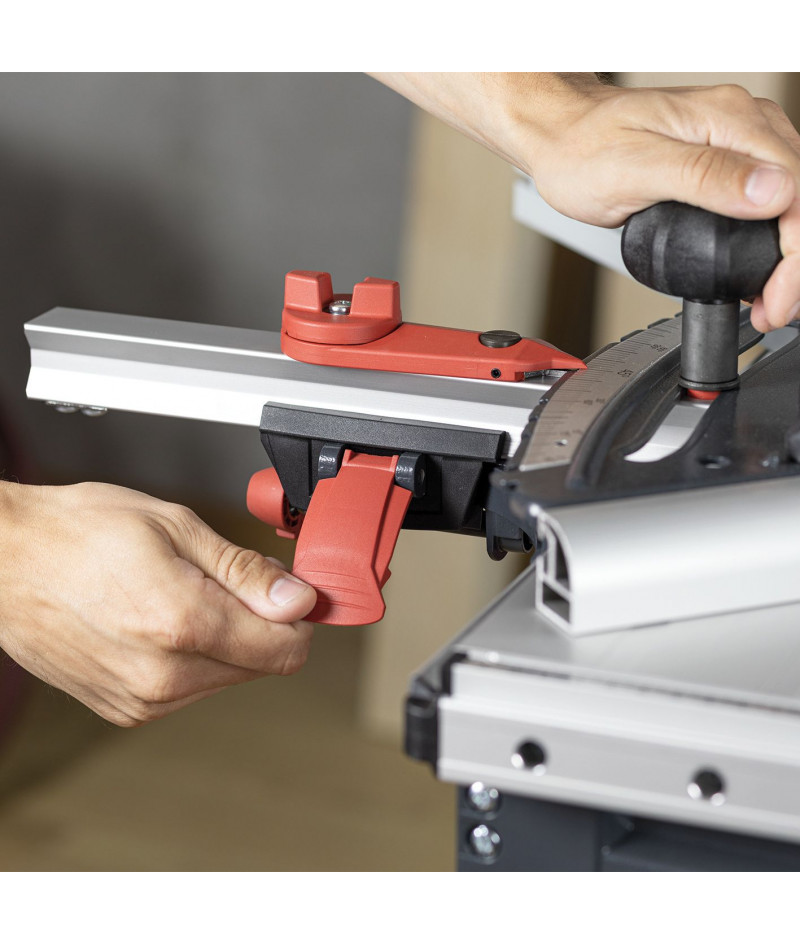 El tope paralelo se puede fijar en el perfil de mesa de forma sencilla y segura. La palanca de sujeción superior permite sujetar y fijar el tope paralelo alineado en el perfil de mesa trasero. Es preciso realizar un ajuste preciso a 1/100mm. La guía de tope se desplaza con las dos palancas de sujeción