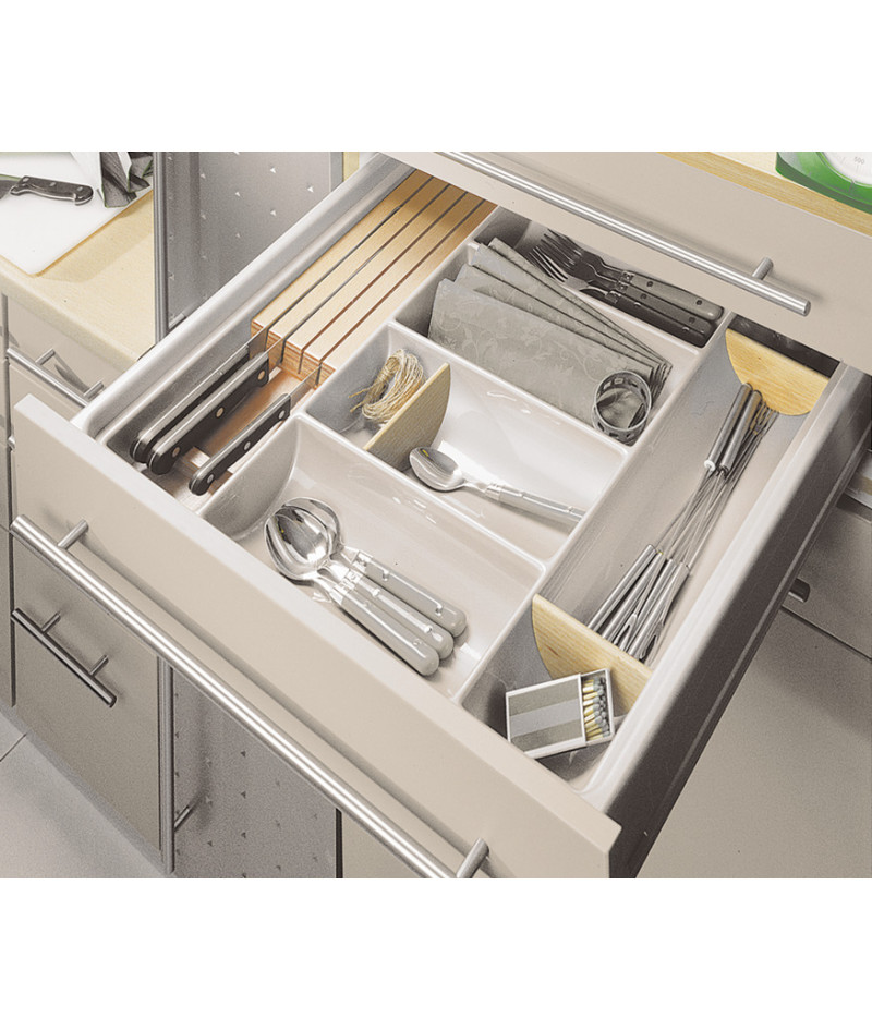 Dimensionado para cajón Vertex y Concept de 500 mm profundidad y espesor de tablero 16 mm. Gran capacidad de almacenaje de cubiertos y otros utensilios de cocina. Fabricado en plástico blanco.