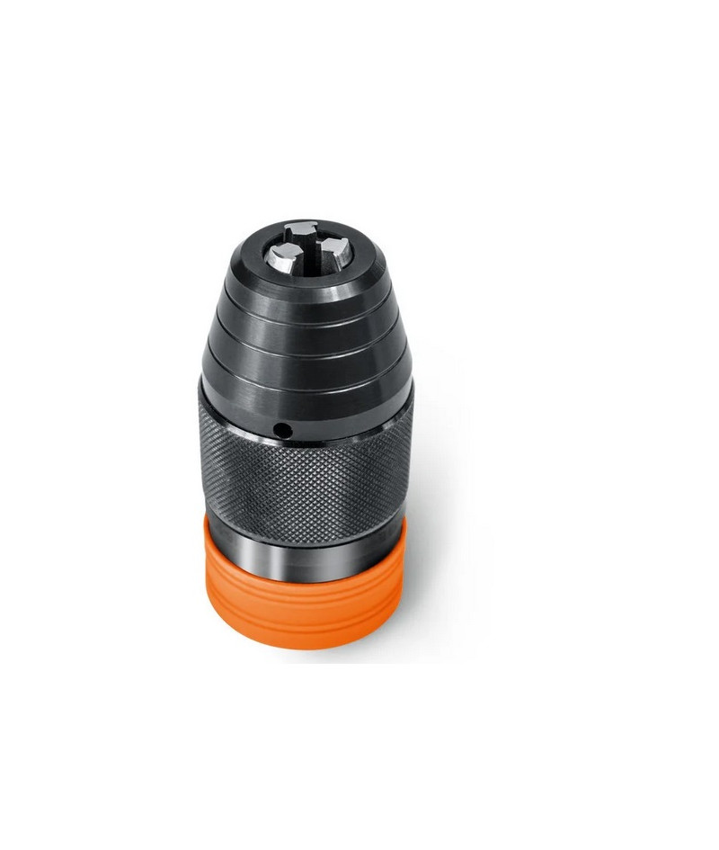 Portabrocas de mordazas planas con pretensado automático metálico de Röhm. Evita el giro de la broca espiral y de la roscadora. Capacidad de sujeción 1,5-13 mm. Trabajo preciso mediante una elevada exactitud concéntrica de hasta 0,35 mm. Compatible con todas las atornilladoras a batería FEIN con alojamiento QuickIN/QuickIN MAX.