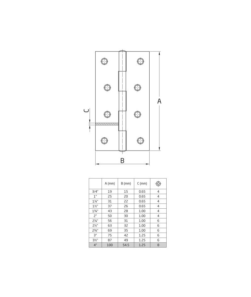 Bisagra cuadrada en acero sin remate. Eje desmontable de ø 6 mm. CÓDIGOTIPO DE ENVASADOMATERIALACABADOMEDIDASA10630 Con EAN Individual Acero Cromado mate 101 x 101 mm