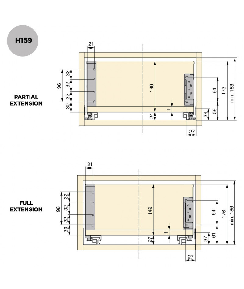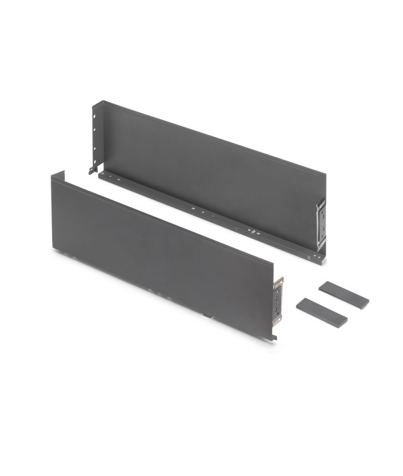 Estos costados de cajón de altura 159 mm poseen un elegante diseño, que ofrece una gran amplitud interior. Permiten regular el frente del cajón ±2mm en vertical mediante excéntrica, así como ±1,5mm en horizontal. Además, dispone de la regulación en altura de la propia guía. Los juegos incluyen: dos costados laterales y un juego de tapas frontales. Están fabricados en acero y acabado pintado gris antracita o blanco.