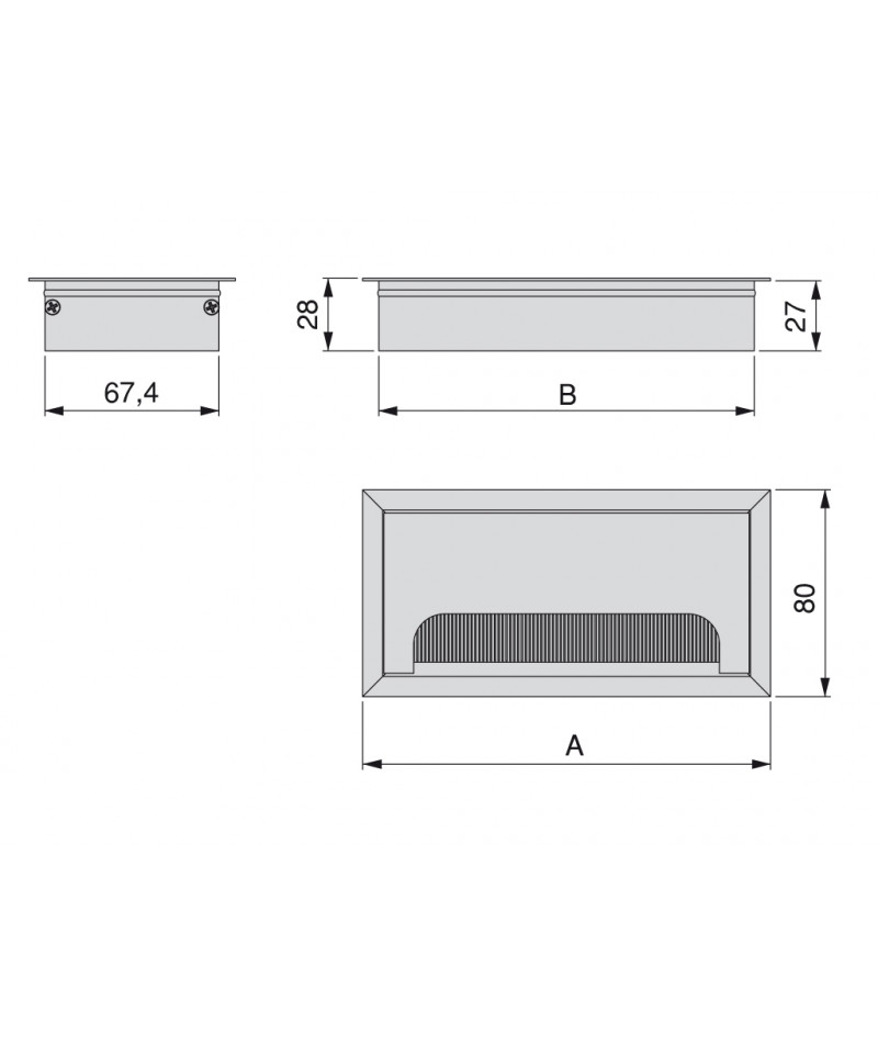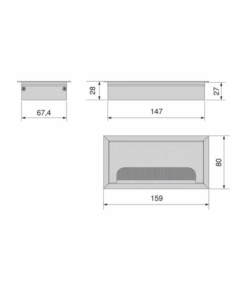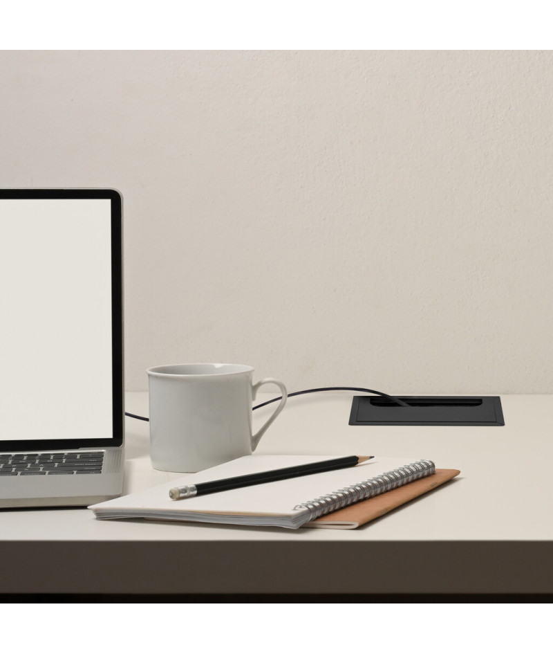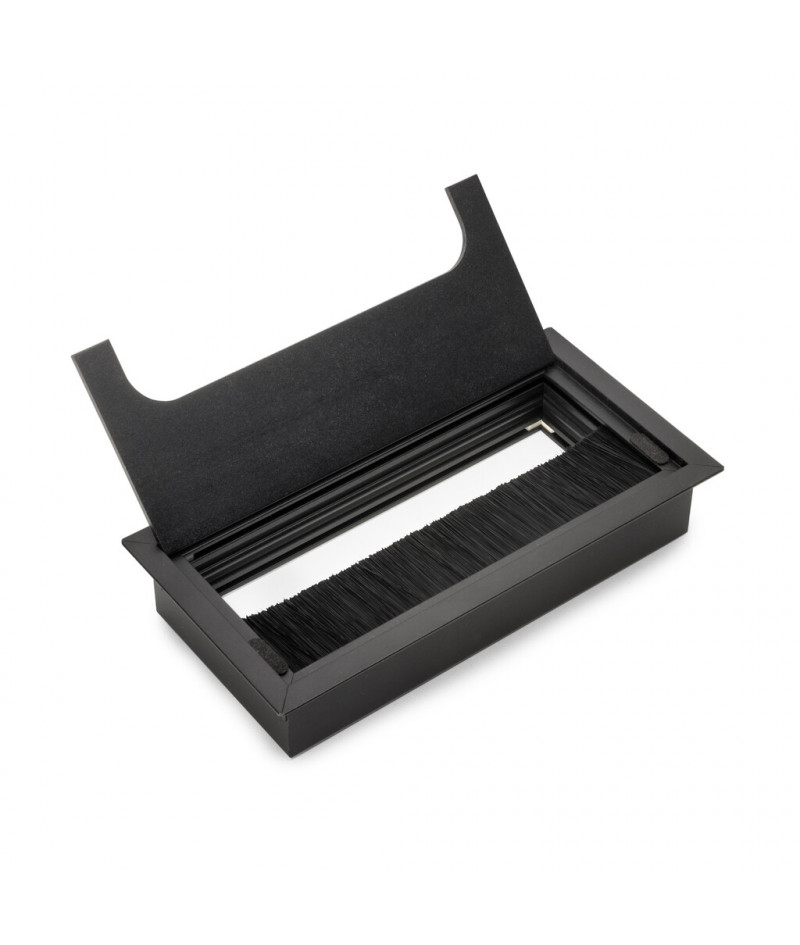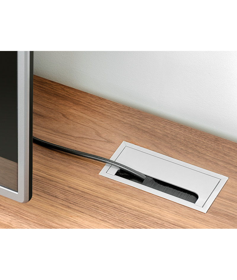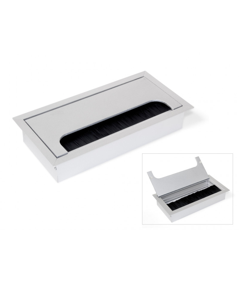 Pasacables rectangular para empotrar en cualquier escritorio de oficina o mesa fabricado en aluminio. Su forma rectangular permite pasar cables de diferente tamaño y grosor y ocultarlos de forma fácil gracias a su tapa abatible.