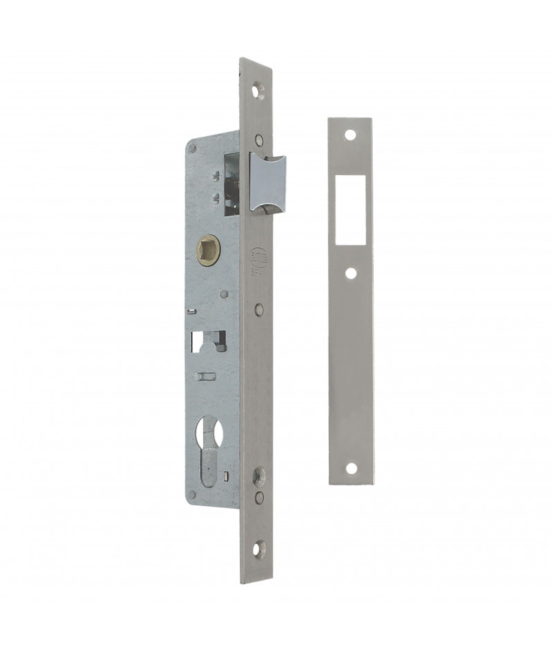 Cerradura de embutir para perfiles europeos de carpintería metálica. Picaporte reversible y palanca de cierre deslizante. Alojamiento para cilindro Europerfil de leva de 15 mm. Distancia entre nueca de manilla y alojamiento de cilindro: 85 mm. Frente y soporte de acero. Nueca para manilla de 8 mm.
