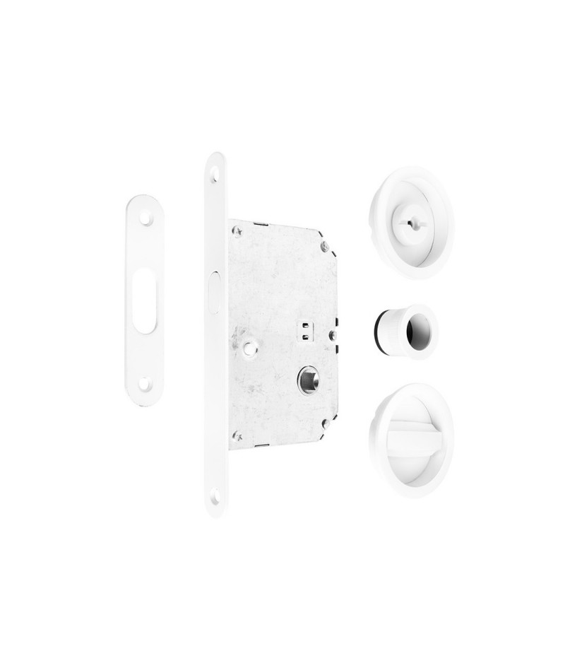 Kit condena puerta corredera redondo Kit de cerradura con muletilla con roseta redonda de 57 mm de diámetro para puertas correderas. Con bloqueo manual y desbloqueo de emergencia. Con entrada 50 mm, se adapta a espesores de puertas entre 35 y 45 mm. Incluye picaporte de pico de loro, condena, desbloqueo, uñero, cerradero y tornillería . Fabricado en...