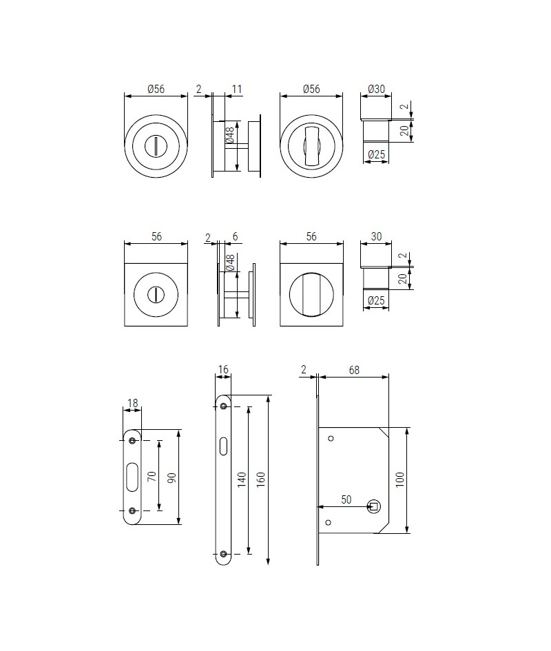 Cerradura de embutir para puertas correderas. Gancho, frente y cerradero en acero inox EN 1.4301. Suministrada con conjunto de tiradores de embutir. Material: EN 1.4301 (AISI 304)