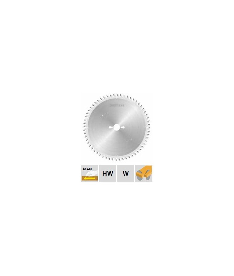 Sierra circular para corte longitudinal y transversal de maderas macizas (blanda y dura), paneles derivados de madera sin revestimiento en aplicaciones de corte universal. Máquina: Para máquinas escuadradoras, sierras de mesa, portátiles, etc. Datos técnicos: Sierra circular con diente alterno en metal duro (HW).