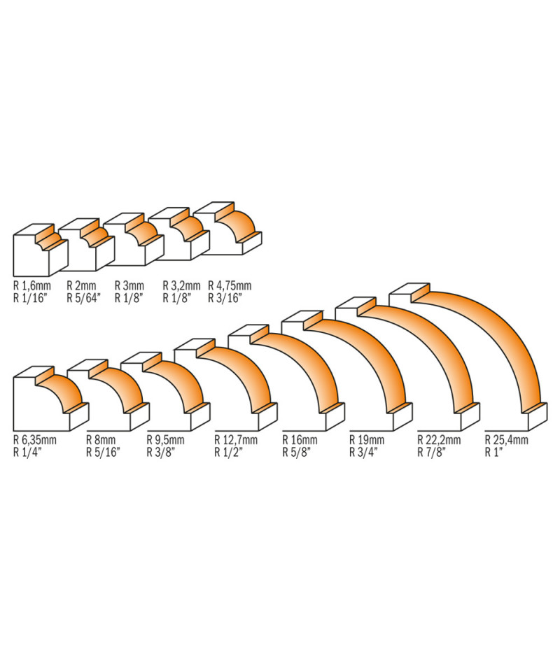 Fresas para recortar laminados Esta nueva fresa CMT es perfecta para recortar laminados. Los cortes de radio cóncavo recortan y biselan los bordes del material, garantizando una superficie lisa al tacto. ¡No es necesario efectuar posteriores operaciones de lijado!
