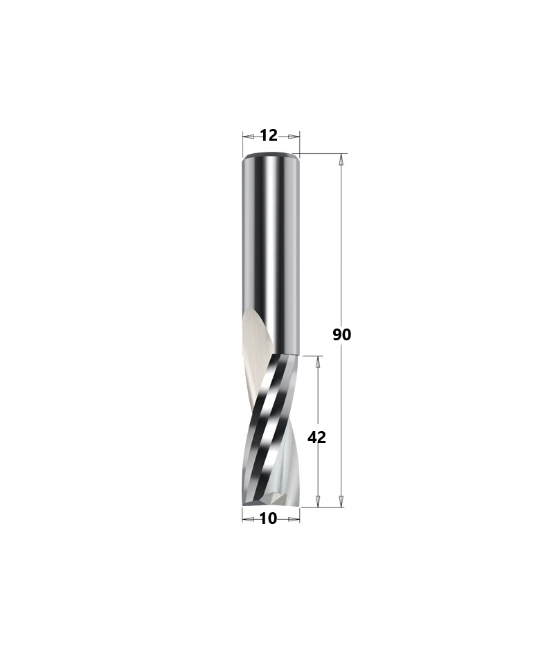 ROTACIÓN DERECHA. Helicoidal negativa. Corte lapeado por una menor fricción y un mejor derrame de las virutas. Para centros de mecanizado y pantógrafos CNC. Para material plástico, (preformados de pequeño espesor 3/4 mm), PVC, HDPE, PET, material acrílico y superficies solidas (CORIAN).