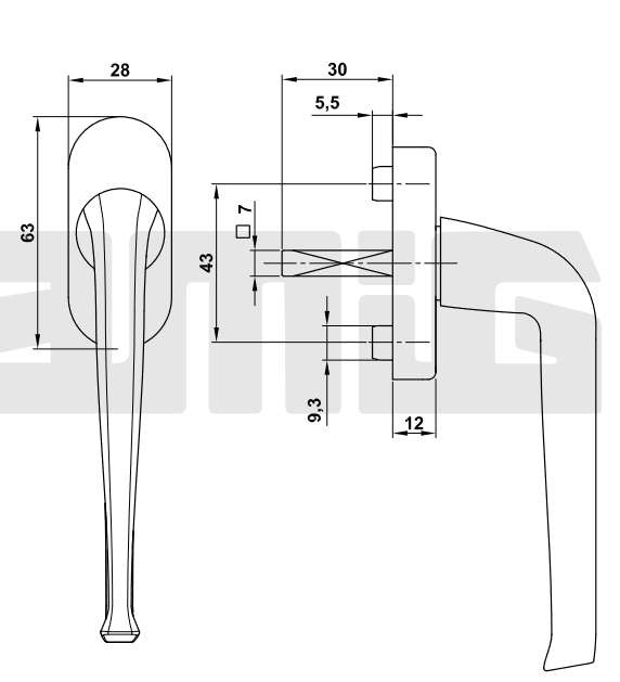 Manilla para ventanas con cuadradillo de 7 mm y tetones de 10 mm Material: Aluminio